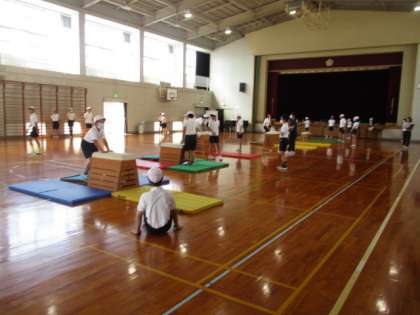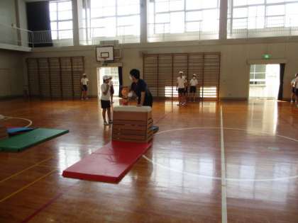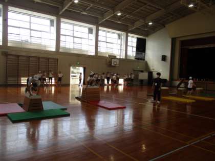 跳び箱で閉脚跳びにチャレンジしていました。友達の動きを参考にしたり,先生に質問したりしながら,自分なりに練習をしていました。
