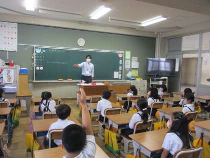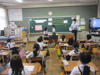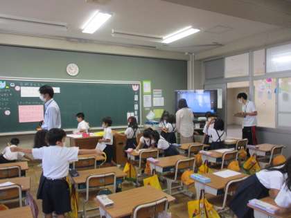算数では「ながさくらべ」の学習を進めていました。今日は教育実習生の研究授業でした。教材をよく研究して授業を行っていました。ペアで教室いろいろなものの横の長さを測って,長さの違いを実感していました。今日で実習期間も終わり,大学に戻られますが,堺の教員として子どもたちの前に立ってくれればと願っています。
