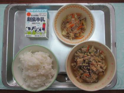 今日の給食は「他人丼,もやしの甘酢煮」でした。親子どんは,とり肉と卵を使って作ります。今日のどんぶりは,とり肉ではなく,牛肉と卵を使っているので,他人どんと言いいます。