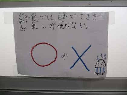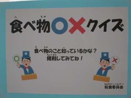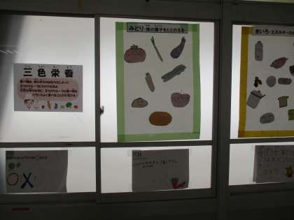 一階の廊下に給食委員会の人たちが作った食育クイズや三色栄養について掲示しています。食のバランスは健康に直結することなので,日々の食事を見直して大人になっても実践を続けてほしいですね。