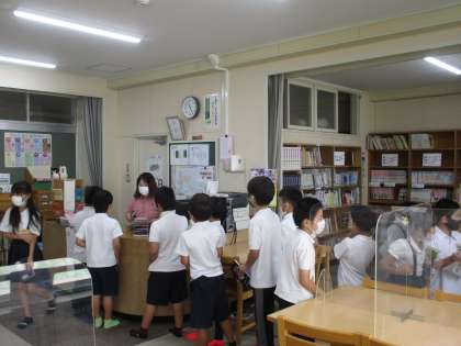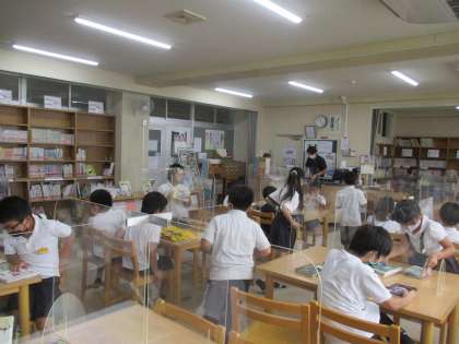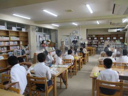 読書指導を学校図書館で行っていました。学年に応じた本を選んで読んでほしいですね。図書館の前にも図書館司書の先生の推薦本などが掲示されているので,それも参考にしていろいろな本と出会ってほしいですね。