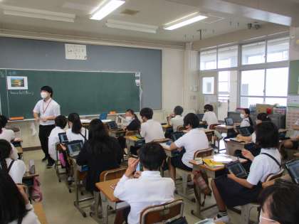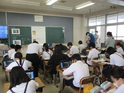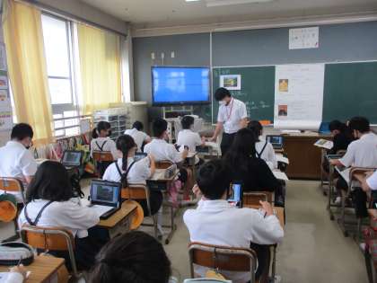 6年生 社会科 教育実習生の研究授業 公開日 2022/09/21 更新日 2022/09/21 6年生 社会では「今に伝わる室町の文化と人々のくらし」の学習を進めていました。今日はこの学習で教育実習生の研究授業を行いました。金閣と銀閣を見比べて,そこから幕府の力について考えていました。だんだんと幕府の力が衰えて,応仁の乱を経て戦国時代に入っていく過程を学んでいきます。タブレットを使って一生懸命考えて授業を進めていました。