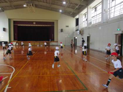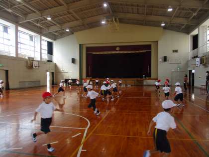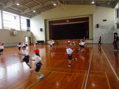体育では「しっぽとり鬼ごっこ」で楽しんでいました。尻尾を取られないように機敏に動いたり相手の尻尾を取るための作戦を考えたりしながら,いろいろな走り方を試して体力をつけていました。
