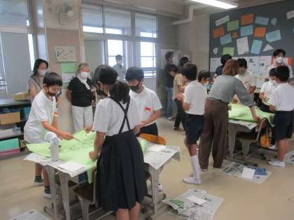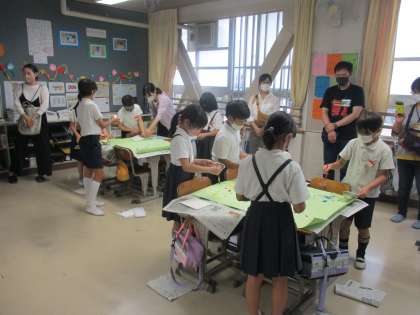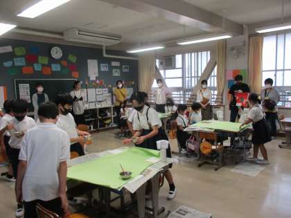 4年生 参観授業 図工 公開日 2022/09/27 更新日 2022/09/27 4年生 図工では「絵具と水とで素敵な模様を作ろう」の制作に取り組んでいました。水に溶いた絵具を筆で模造紙に飛ばして,いろいろな模様を描いていました。筆で描くのではないので,偶然できる模様や思いもよらない模様ができて楽しく活動ができました。