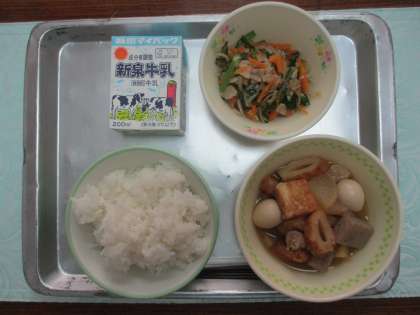 今日の給食は「関東煮,もやしとにらのソテー」でした。にらの独特の強い香りは「アリシン」という成分です。アリシンはビタミンBー1の吸収を高めて,疲労回復を助ける働きがあります。