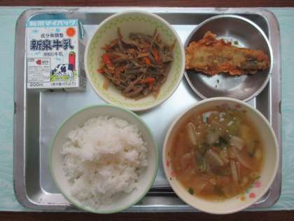 今日の給食は「味噌汁,きんぴらごぼう,イワシの天ぷらの甘酢かけ」でした。「バランスの良い食事」のポイントは, 主食・主菜・副菜・汁物をそろえることです。今日の給食では,主食・・ごはん 主菜・・いわしのてんぷらのあまずかけ 副菜・・きんぴらごぼう 汁物・・みそ汁 です。