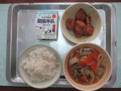 今日の給食は「すき焼きうどん,厚揚げの生姜焼き」でした。今日は,牛肉を使ったすきやきうどんです。牛肉は,豚肉や鶏肉に比べると,血液の材料となる鉄分をたくさん含んでいます。