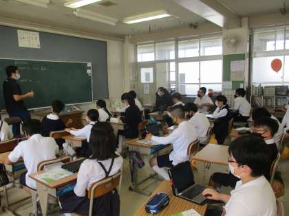外国語では「行きたい国の紹介スライドを作ろう」をめあてにして学習を進めていました。I want to 〜 の構文を基本にして,一人一人がその国でやりたいことやその国の紹介をスライドにしていきます。英語の学習とタブレットの操作を進めていく情報の学習です。6年生は操作も慣れていて,取り組みも早いですね。