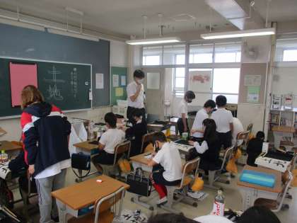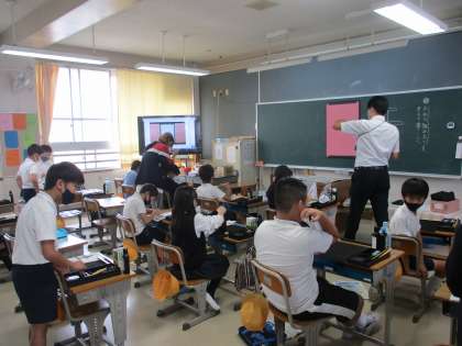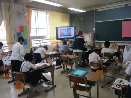 書写では「土地」を課題にして毛筆で書いていました。「左右の組み立てを考えて書こう」をめあてにして,バランスを考えながら一生懸命取り組んでいました。