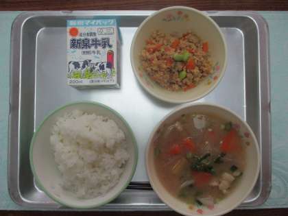 今日の給食は「そぼろ丼,さつま汁」でした。「さつま」は鹿児島県の昔の呼び名です。さつま汁は鶏肉を使ったみそ汁で,鹿児島県の郷土料理です。