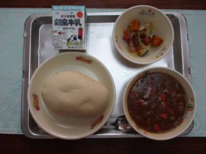 今日の給食はオリーブパン,牛乳,かぼちゃのチーズやき,ポークカレーシチューです。オリーブパンには,オリーブ油が使われています。オリーブ油は,オリーブという果実からしぼった油で,パスタなどのイタリア料理にはかかせないものです。