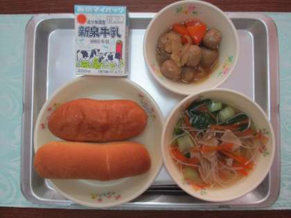今日の給食は「ビーフンスープ,肉団子の甘酢煮,揚げパン」でした。ビーフンは,うるち米(いつも食べているお米)を粉にしたものを原料として作ります。今日のようにスープに入れたり,油で炒めて焼きビーフンにしたりします。