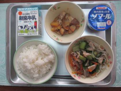 今日の給食は「フォー,ガイヤーン,ヨーグルト」でした。フォーはベトナムを代表する麺です。 米から作られる半透明の麺で, 日本のきし麺と似た,平たい形をしています。