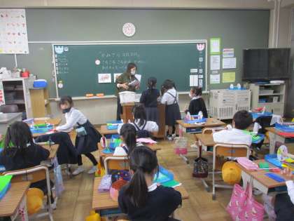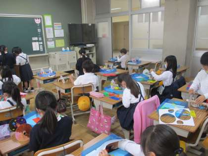 図工では「かみざらころころ」の制作を進めていました。色塗りや飾りも一人ひとり個性あふれるものができて,楽しそうに取り組んでしました。転がった時の車輪の模様がどうなるか楽しみですね。
