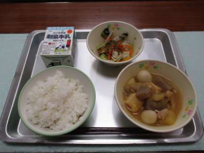 今日の給食は「かんとうに・ごまずかけ・ごはん・牛乳」です。