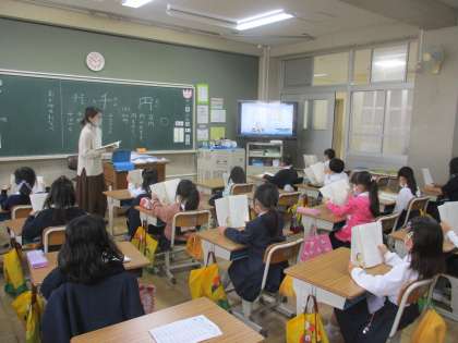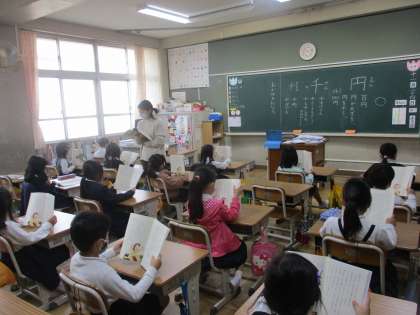 国語では「おかゆのおなべ」の学習を進めていました。グリム童話の作品で今までとは違い少し長いお話になります。今日は範読を聞いてお話の流れを理解していました。いろいろな童話集を読んで,心を豊かにしてほしいと思います。