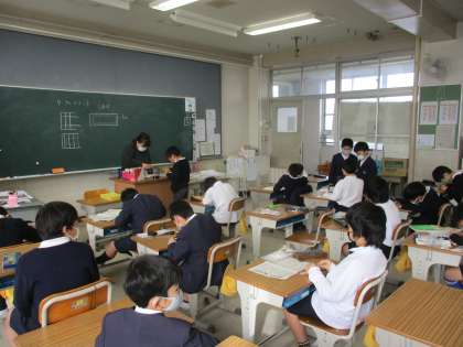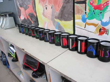 図工では「サークルスタンド」の仕上げを行っていました。キラキラとする美しいシールを使って名前を英語で書いて切り取り,きれいに張り付けていました。ペン立てとして家で活用してくれればと思います。