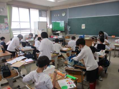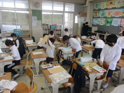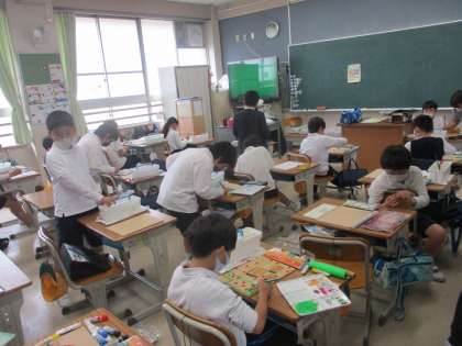 3年生 図工 公開日 2022/11/29 更新日 2022/11/29 3年生 図工では「トントンコロコロゲーム」の制作を進めていました。名前はいろいろありますが「コリントゲーム」の制作になります。ゲームのバック絵を描いて,最後は,くぎを打って,ビー玉の進む道を作っていきます。どんな道筋にするとゲームが面白くなるかを考えながら,くぎを打っていきます。完成した後でゲームを楽しんでほしいですね。