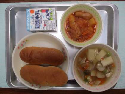 今日の給食は「ワンタン,煮込みウインナー,揚げパン」でした。揚げパンは,ミニパンの一つを給食場で油で揚げて調理しています。油の中でプカプカ浮いているミニパンを網じゃくしで,上手にひっくり返しながら揚げています。