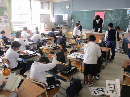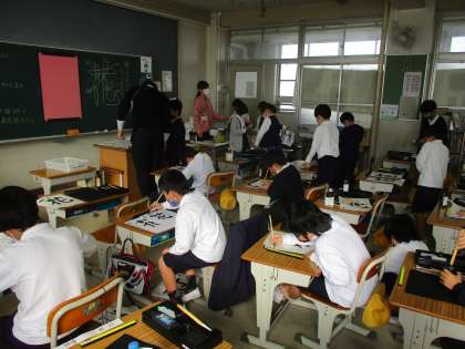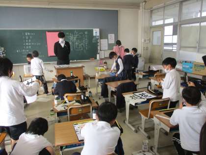 3年生 書写 公開日 2022/12/02 更新日 2022/12/02 3年生 書写では「花」を毛筆で書いていました。今日は「三つの部品をくっつけて書こう」をめあてにして取り組んでいました。漢字をパーツに分けて考えて,ばらばらにならないように配置を考えながら取り組んでいました。