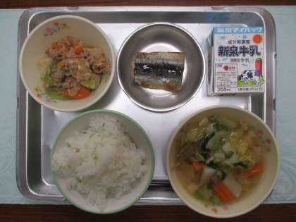 今日の給食は「芋煮,五目汁,サンマの塩焼き」でした。芋煮は山形県や宮城県でよく作られる郷土料理です。秋に河原などの野外で里芋や季節の野菜・豚肉や牛肉を入れて作ります。しょう油味やみそ味があります。