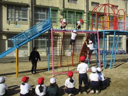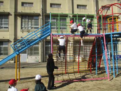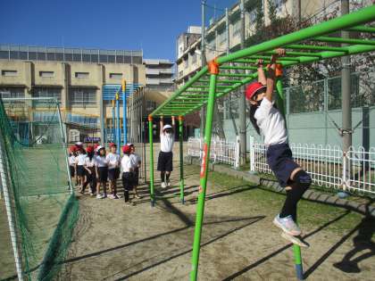 1年生 体育 公開日 2022/12/06 更新日 2022/12/06 1年生 体育では遊具を使って体力づくりを行っていました。ジャングルジムや雲梯を使って自分の力に合わせて楽しんでいました。入学当初から比べると,力もついて素早く登ったり最後まで渡り切ったりできました。遊び時間も遊具を使って,遊びながら体力をつけてくれればと思います。