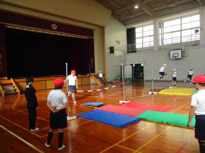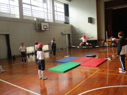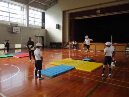 4年生 体育 公開日 2022/12/07 更新日 2022/12/07 4年生 体育では「ダイナミック高跳び」に取り組んでいました。4年生はバーの代わりにソフトな素材を跳び越えます。今日はロイター板を使ってふわりと浮く感覚を楽しみながら,跳び越えることを楽しんでいました。跳ぶ方向や助走のスピードなどもこれから考えながら学びを深めてくれればと思います。