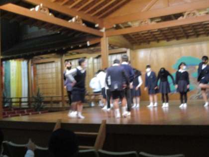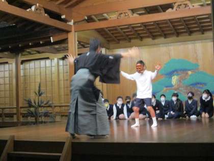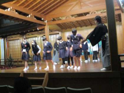 6年生 国語 公開日 2022/12/09 更新日 2022/12/09 6年生 国語では「古典芸能に親しむ」の中で狂言を鑑賞しました。堺能楽会館で能舞台や所作,せりふの説明を聞きました。実際に舞台に上がって面をつけたしぐさをしたりすり足で歩いたりしながら,伝統文化に触れていました。映像を通してではなく実演を鑑賞したことで,狂言の面白さやせりふの迫力を肌で感じてくれたことと思います。