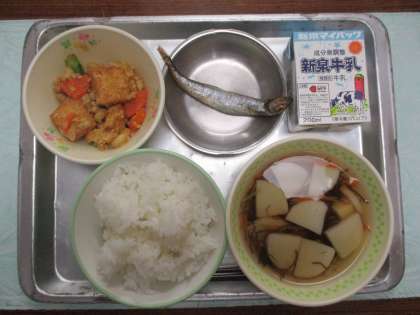 今日の給食は「大豆と厚揚げのピリ辛炒め,もずく汁,焼ししゃも」でした。もずくはわかめやこんぶ・ひじきと同じ海藻のなかまです。海藻にはカルシウムがいっぱいあります。もずくはもずく汁にしたり,酢の物にしたり,かき揚げにしたりします。