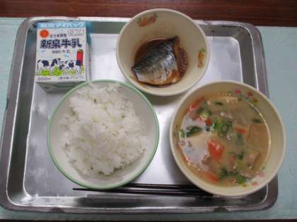 今日の給食は「豆乳入りかす汁,サバの生姜煮」でした。日本酒は米と米こうじと水からできています。米(蒸したもの)に米こうじを混ぜて発酵させ,もろみを作ります。もろみを絞ると酒と酒粕ができます。今日はその酒粕を使ってかす汁を作つくりました。