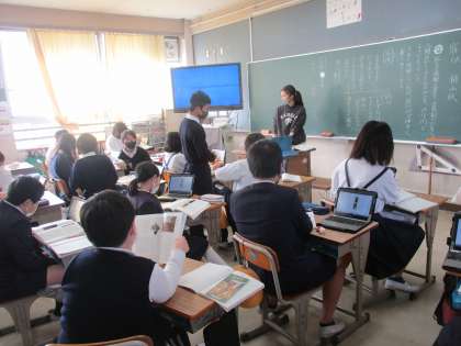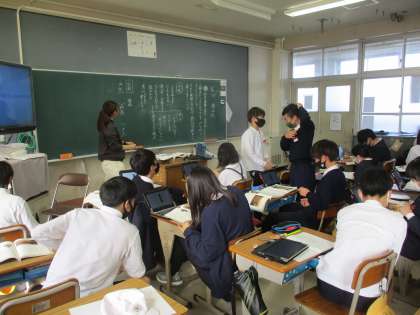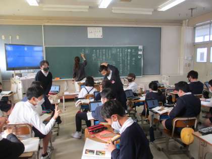 6年生 国語 公開日 2022/12/14 更新日 2022/12/14 6年生 国語では狂言の「柿山伏」の学習を進めていました。能楽会館で鑑賞した狂言を思い出しながら,実際に役割を決めて狂言の面白さを引き出します。所作も加えて古典芸能に親しんでほしいと思います。
