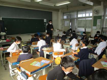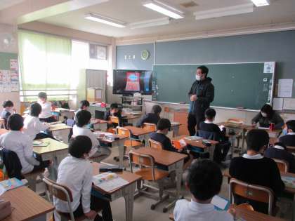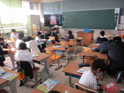 外国語活動では,作ったグリーティングカードをペアで見せ合い,英語で説明していました。一人ひとり個性あふれるカードを作り楽しそうに説明していました。楽しみながら英語に触れあっていました。