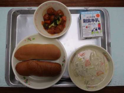今日の給食は「豆乳スープ,肉団子のトマト煮,揚げパン」でした。「肉団子のトマト煮」にブロッコリーが使えわれています。たくさん採れて,おいしい時期を 「旬」といいます。ブロッコリーは,これからの季節が旬です。