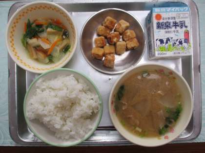 今日の給食は「高野豆腐のから揚げ,豚汁,大阪しろなの煮びたし」でした。高野豆腐は,豆腐を乾燥させたものです。だし汁で炊くことが多いですが,今日は,片栗粉をまぶして油で揚げました。