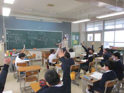 4年生 算数 公開日 2023/01/23 更新日 2023/01/23 4年生 算数では「帯分数と真分数の足し算」の学習を進めていました。帯分数の整数部分の扱いをどうするのかを考え,「早く・正確に・簡単な数に」を念頭に入れて計算方法を考えていました。一人一人の考えを聞いて,わかりやすそうな解法を共有していました。
