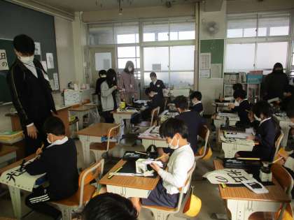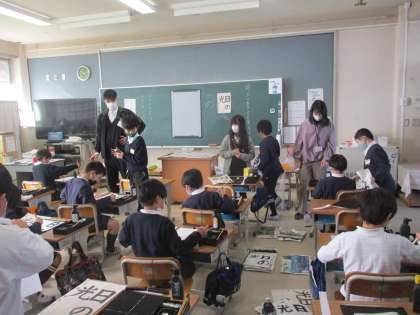 3年生 書写 公開日 2023/01/25 更新日 2023/01/25 3年生 書写では毛筆で「日の光」に取り組んでいました。今日は「の」の書き方について注意して書いていました。毛筆では,ひらがなが結構難しいですね。