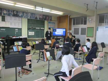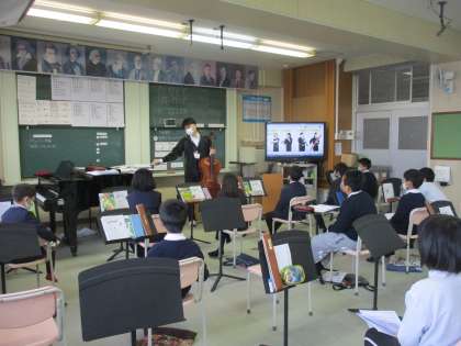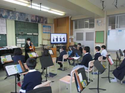 4年生 音楽 公開日 2023/01/26 更新日 2023/01/26 4年生 音楽では「山の魔王の宮殿にて」の鑑賞を行っていました。曲を聴いたイメージをつかんだり物語を考えたりしながら,曲から想像を膨らませていました。自分なりに曲から受けるイメージを映像化していくことは楽しいですね。先生のチェロの演奏を聴いて,想像もも深まりました。