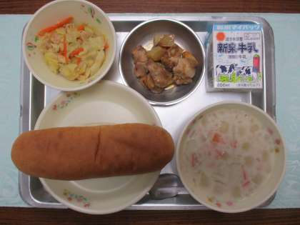 今日の給食は「クマラスープ,タンドリーチキン,野菜のソテー」でした。堺市は,ニュージーランドの「ウェリントン」と姉妹都市です。 クマラスープは,ニュージーランドの料理で,「クマラ」は現地のことばで「さつまいも」のことです。