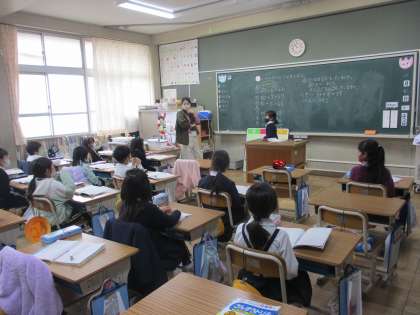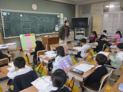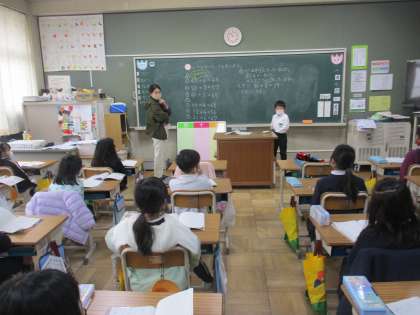 1年生 算数 公開日 2023/02/07 更新日 2023/02/07 1年生 算数では「たしざんとひきざん」の学習を進めていました。今日は「いろいろなけいさんをしよう」をめあてにして学んでいました。文章題での解き方で,31+8の計算方法をみんなで確かめていました。まず1の位の計算をして,その次に10の位の計算を行うことを自分たちで説明していました。また,「ぜんぶで,みんなで,のこりは」などの言葉に注意して,たし算かひき算かの見通しをもって答えを出していました。