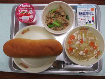 今日の給食は「米粉マカロニスープ,豚肉の香味炒め,フルーツヨーグルト」でした。ふだん食べているマカロニは小麦粉でできていますが,今日のマカロニは,お米を粉にした「米粉」でできています。