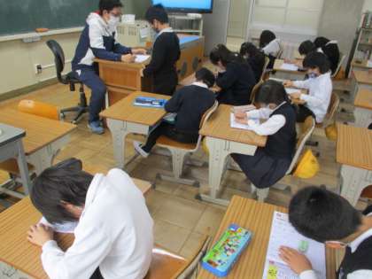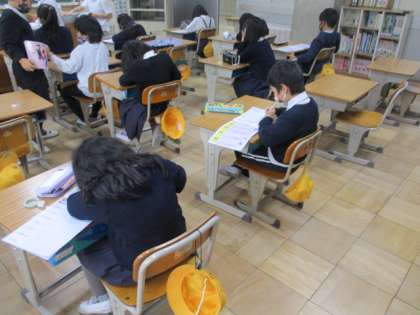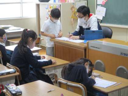漢字の学習をしていました。文章に入る漢字を,文章の意味に合うように書き込んでいました。漢字は文字だけで覚えるのではなく,正しい意味で使える漢字にしていくことが大切です。また,読めない漢字は基本的には書けません。だから,漢字を書けるようにするには,まずは読めるようにすることが大切です。