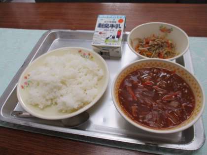 今日の給食は「ハヤシライス・ツナごぼういため・牛乳」でした。ごはんのことを「めし」と言うのは,昔,ごはんはえらい人の「めしあがるもの」だったので,短くして「めし」になったと言われています。