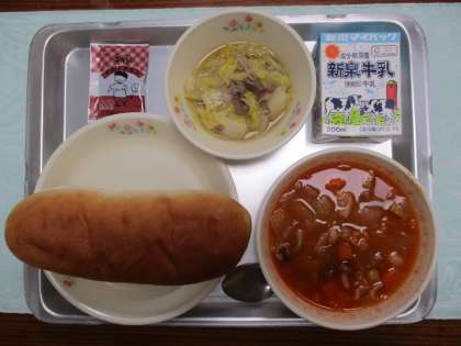 今日の給食は「ポークシチュー,白菜の洋風煮,チョコレートクリーム」でした。シチューとは,肉や野菜をひとつの鍋で長時間煮込んだスープのことで,今日は豚肉と野菜のシチューです。