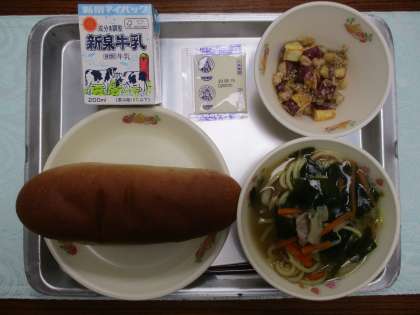 今日の給食は「醤油ラーメン,豆かりんとう,ソフトチーズ」でした。かりんとうは,奈良時代に遣唐使によって伝えられたという説があります。今日は,大豆とさつまいもに片栗粉をまぶして,油で揚げました。