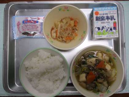 今日の給食は「いためなます,すき焼き風煮,小魚の佃煮」でした。なますは,肉や魚を細長く切って,砂糖や酢で味付けした料理のことです。現在は,野菜や魚を砂糖や酢で味付けしたものが多くなりました。