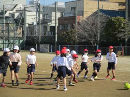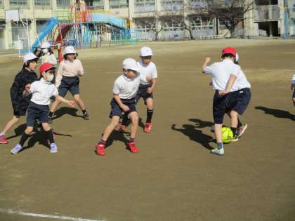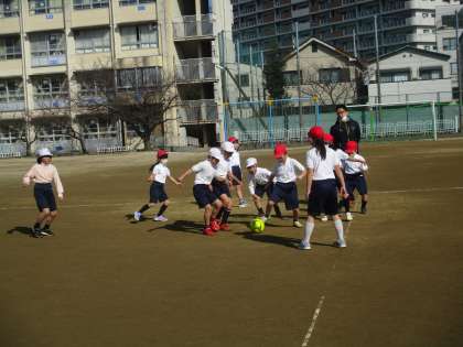 2年生 体育 公開日 2023/02/17 更新日 2023/02/17 2年生 体育では「サッカー遊び」に取り組んでいました。ドリブルの練習でボール扱いに慣れたあとサッカー遊びでゲームを楽しんでいました。ゴールに向かってボールをけりあいながらなかよくゲームを進めていました。