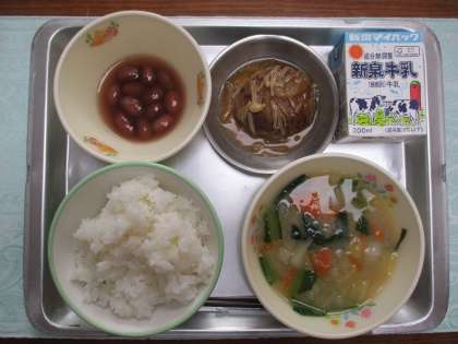 今日の給食は「金時豆の甘煮,ハンバーグきのこソース,みそ汁」でした。豆は日本人が古くから食べている穀物のひとつです。食物せんいが豊富で,おなかの調子を整える作用があるといわれています。