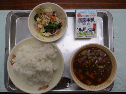 今日の給食は「カレーライス、花野菜サラダ」でした。花野菜とは,植物の花の部分を食たべている野菜のことです。今日のサラダには,ブロッコリーとカリフラワーの二つの花野菜が使われています。