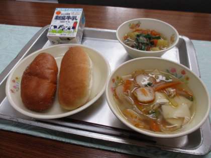 今日の給食は「中華風にくじゃが・ワンタン・ミニパン・あげパン・牛乳」です。