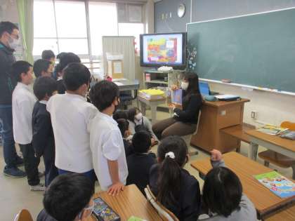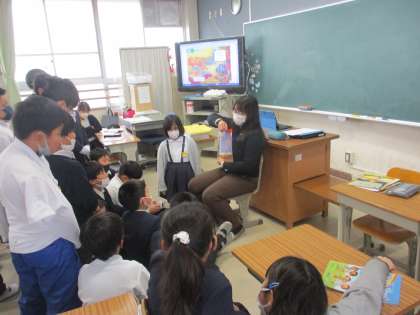 外国語活動ではNSの先生が読み聞かせをしていました。英語で書かれた絵本を読んで、子どもたちをひきつけてくれました。日本の絵本と外国の絵本との描写や人物の描き方などに文化の違いを感じてくれたことと思います。